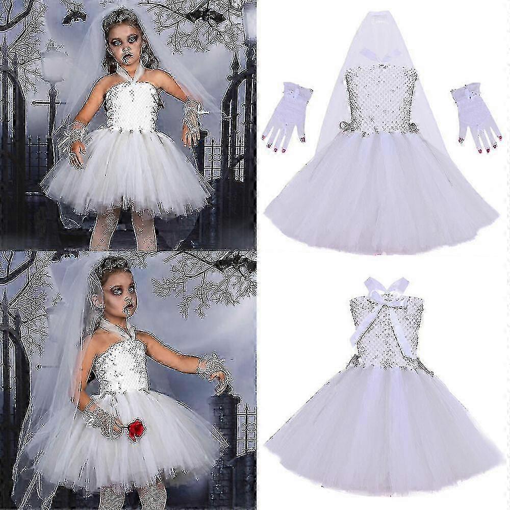 Girls Halloween Ghost Bride Cosplay Costume Dress Veil Vampire Tulle Fancy Dress