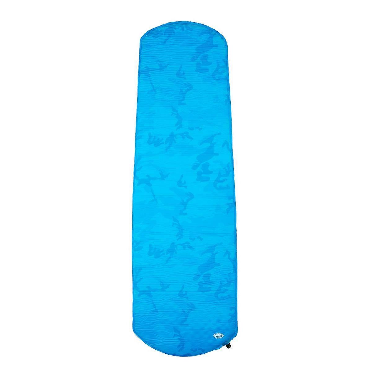 Blå självuppblåsande campingmatta, kompakt och bärbar